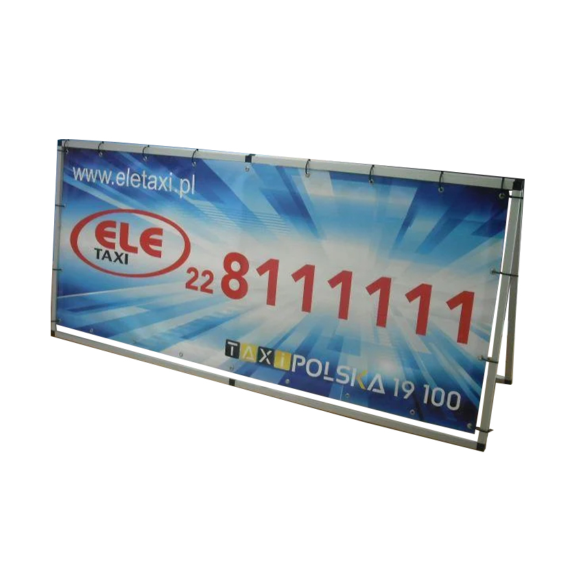 Banda reklamowa to stabilna rama wykonana z aluminiowych prostokątnych rurek połączonych ze sobą plastikowymi łącznikami. Do niej, za pomocą gumowych ekspanderów z plastikowym haczykiem (których w zestawie są 24 sztuki), instaluje się jeden lub dwa zaoczkowane bannery o wymiarach 205×100 cm. Co istotne, w komplecie z każdą bandą reklamową znajduje się też torba transportowa.