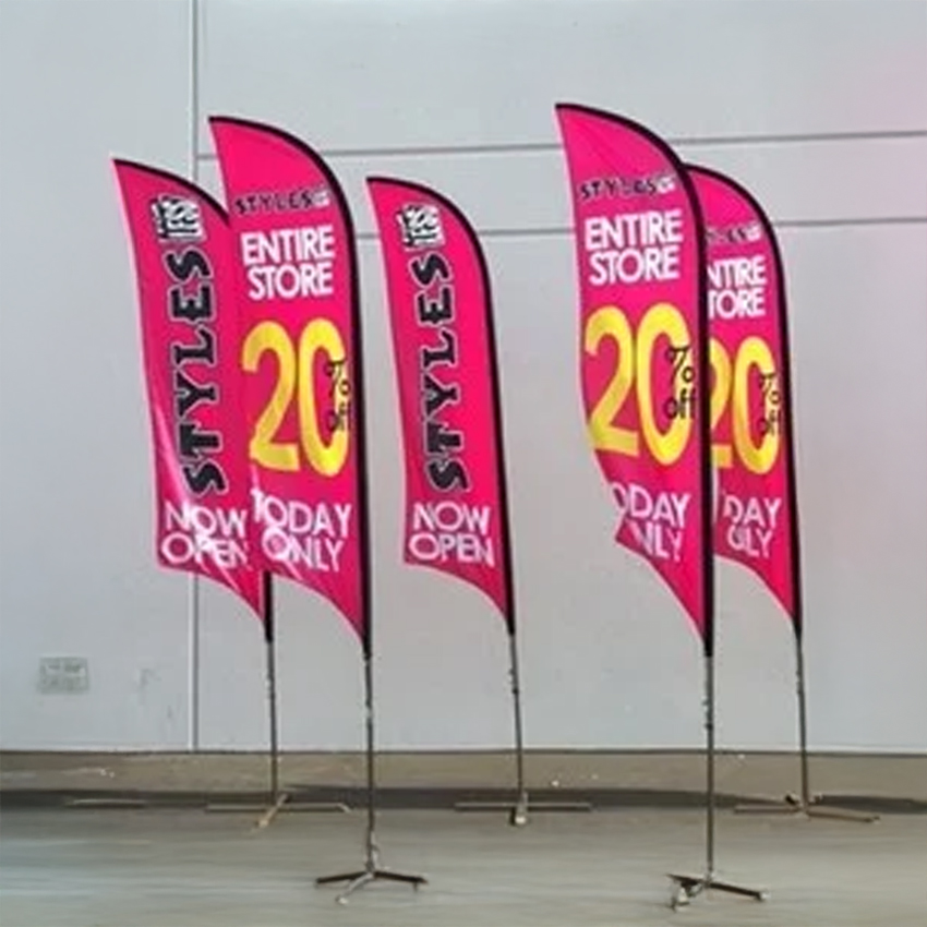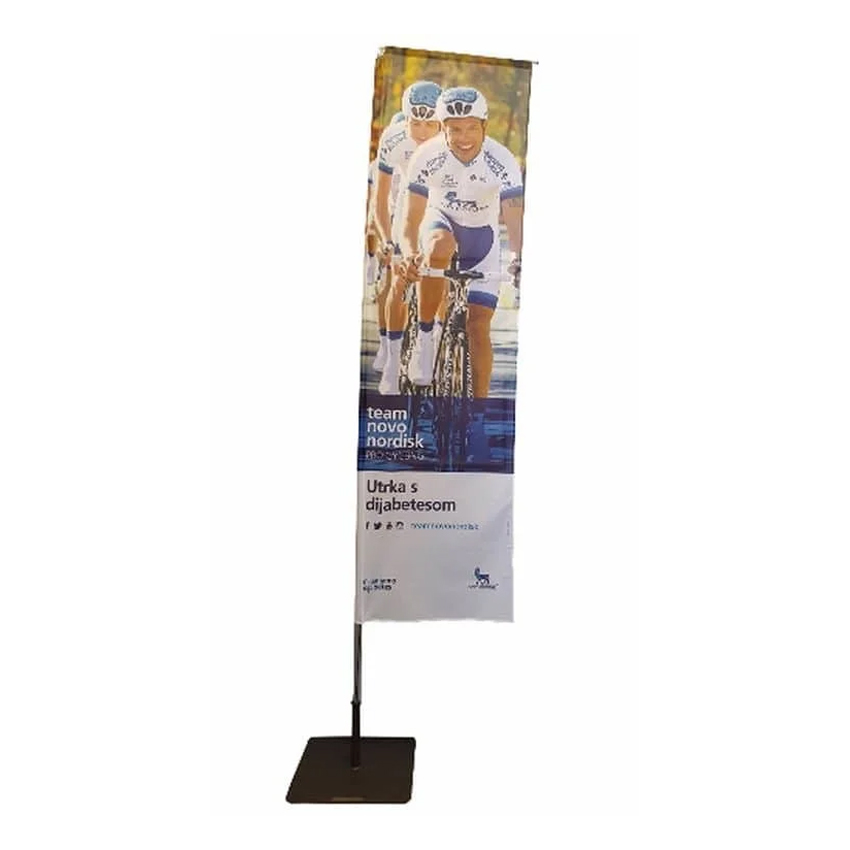 Dzięki 4-segmentowej budowie masztu (2 segmenty aluminiowe + 2 z włókna szklanego) można wybrać jeden z dwóch kształtów flagi reklamowej typu winder z nadrukiem: