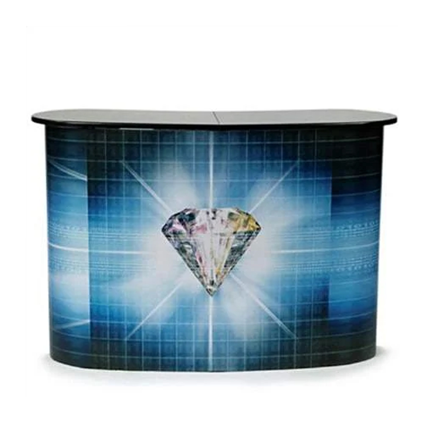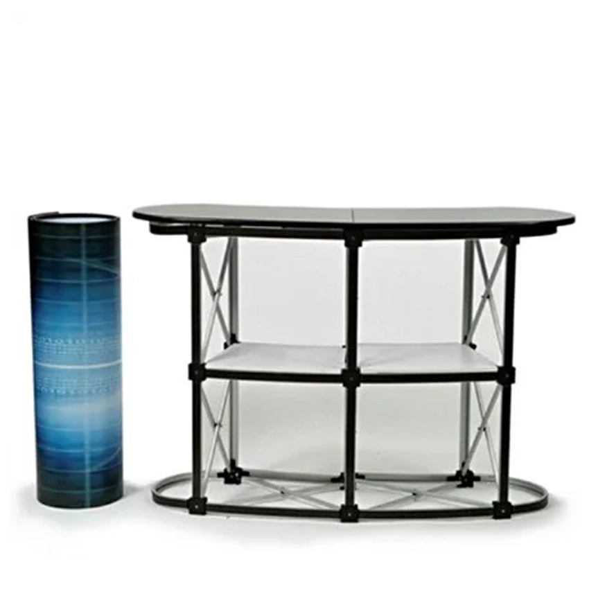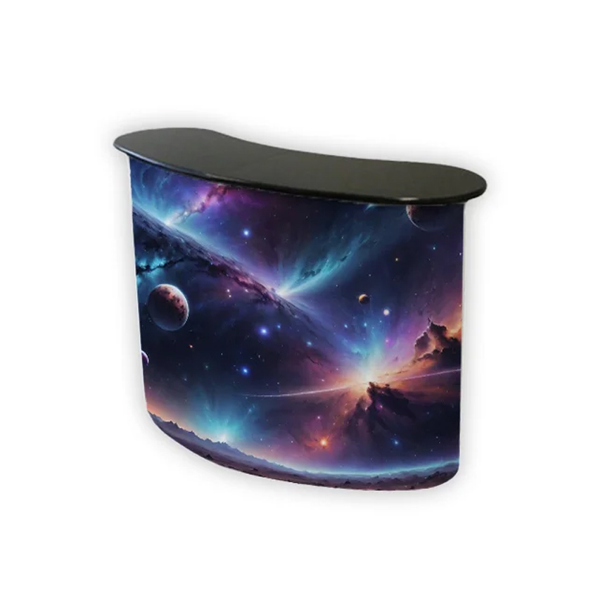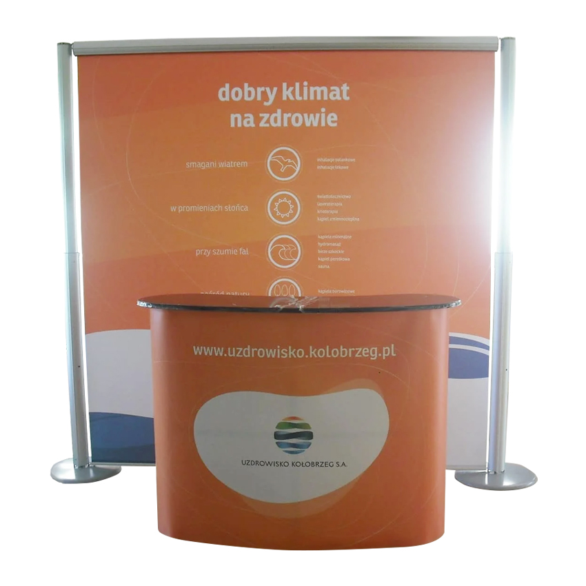 Konstrukcja aluminiowa 2 x 2 moduły jak w ściankach Pop Up, owijana mocowanym magnetycznie panelem na grafikę o wysokości 86 cm i długości 218 cm (widoczne 140 cm).