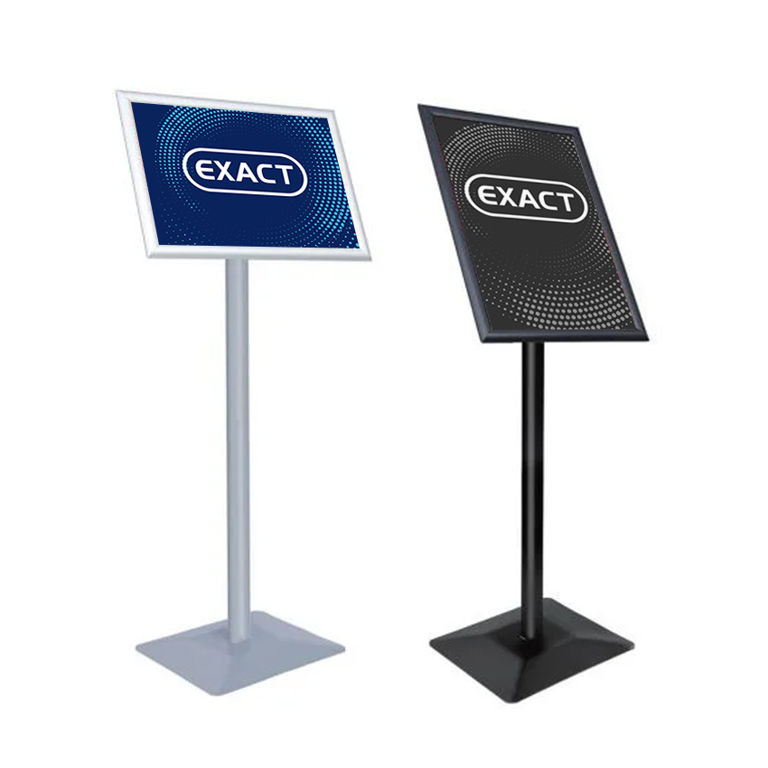 Ramka aluminiowa OWZ z docinanymi narożnikami na aluminiowej nodze osadzonej na podstawie 25 x 34 cm. Wysokość 120 cm.