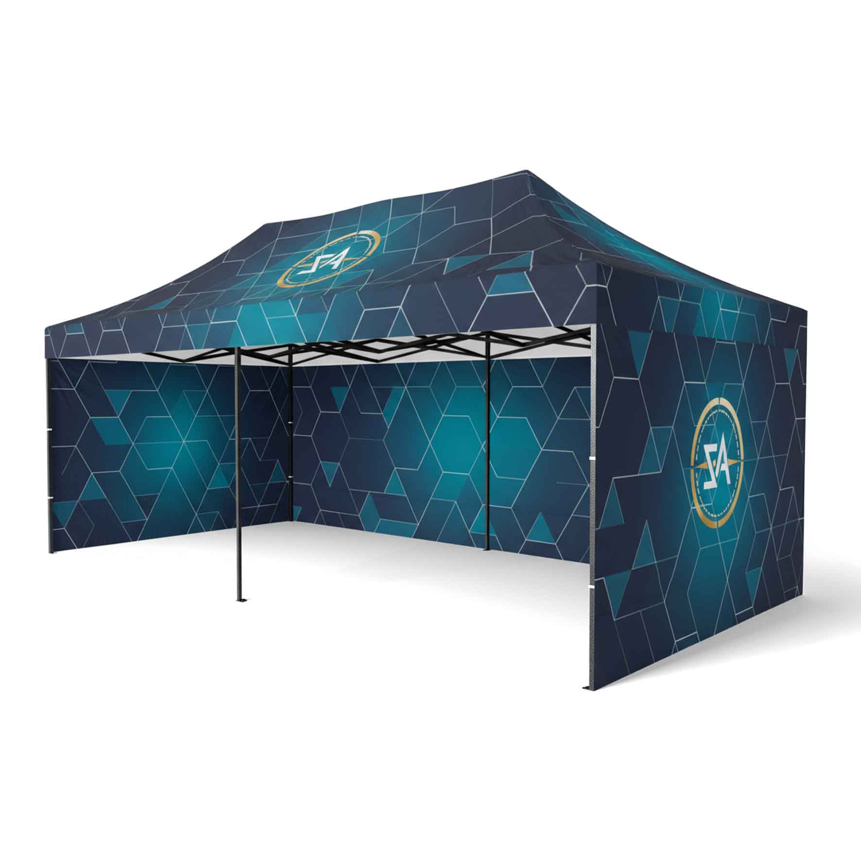Namiot reklamowy posiada aluminiowy stelaż. Konstrukcja wykonana jest z profili o grubości 1,2 mm i przekroju sześciokątnym 40 mm, składana bez użycia narzędzi. Oferujemy namioty reklamowe z nadrukiem w dwóch rozmiarach: 3 × 3 m oraz 3 × 4,5 m, oba o czterostopniowo regulowanej wysokości do max. 350 cm.