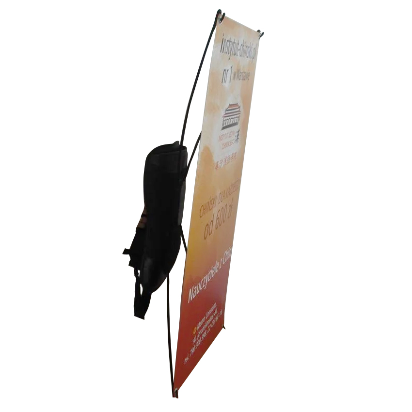 Mobilna ścianka reklamowa. Lekki komfortowy plecak z prętami z włókna węglowego na które zakłada się zaoczkowany na rogach wydruk 100 x 50 cm. Szczególnie efektowny w przypadku użycia przez grupę osób, które mogą uformować całą „żywą ścianę reklamową”.