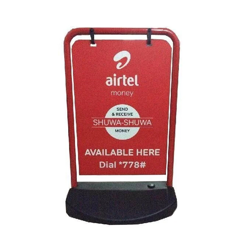 Rama z rury stalowej pomalowana proszkowo na kolor czarny osadzona na plastikowym zbiorniku .Wielkość grafiki 48*70 cm , standardowo jest to dwustronnie drukowana płyta ze spienionego PCV ( do zakupienia osobno ).