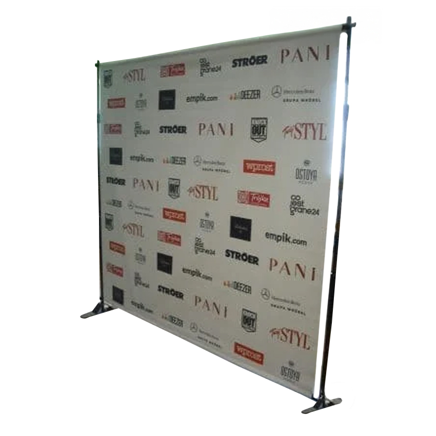 Ścianka bannerowa to rama z aluminiowych rurek o regulowanej teleskopowo wysokości w zakresie 100-240 cm i szerokości 132-245 cm, która posiada stopy z blachy stalowej. Produkt dostępny jest w dwóch wersjach: aluminium anodowane lub powlekane proszkowo na kolor czarny. Banner z grafiką można zaoczkować i przytwierdzić do konstrukcji za pomocą plastikowych trytek lub zrobić na jego dolnej i górnej krawędzi tunele szerokości 7 cm.