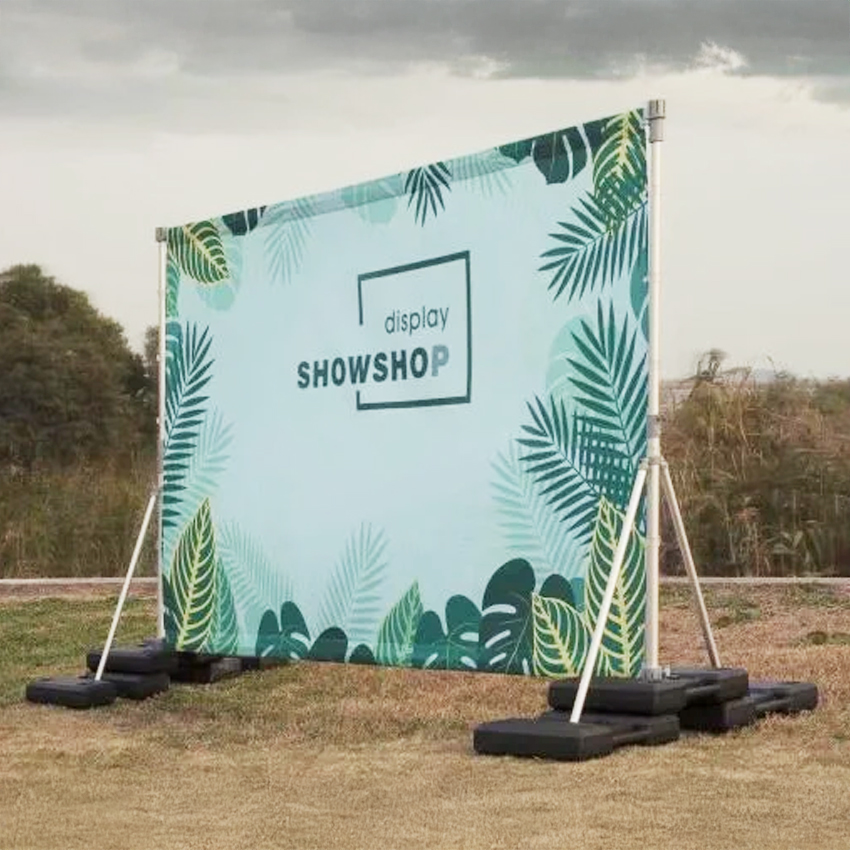 Jest to stelaż z rurek aluminiowych z podstawami stalowymi, które obciąża się kontenerami na wodę lub piasek. Grafika tekstylna ( najlepiej blockout ) wielkości 300 x 230 cm ma w górnej i dolnej krawędzi tunele , z boków jest zaoczkowana. Cena netto stelaża z torbą transportową wyposażoną w kółka – 1499 zł / łącznie z grafiką – 2299 zł,; Cena netto kontenera – obciążnika 50 x 50 x 12 cm , o wadze po napełnieniu 20 kg – 99 zł.