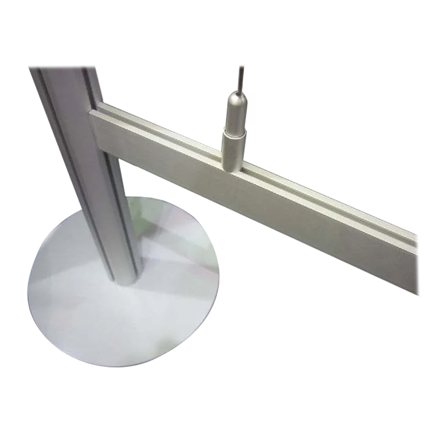 Ścianka opiera się na prostokątnej konstrukcji wykonanej z aluminium w kolorze srebrnym, co nadaje całości lekkości i nowoczesnego charakteru. Aluminiowa rama współgra z dwoma okrągłymi, stabilnymi podstawami, które zapewniają pewne ustawienie nawet przy wzmożonym ruchu wokół ekspozycji. Po bokach ramy zamocowane są stalowe linki, których zadaniem jest solidne podtrzymanie panelu graficznego.