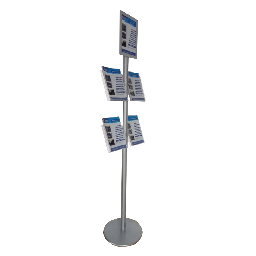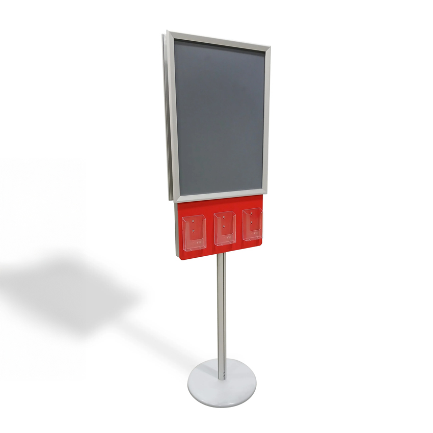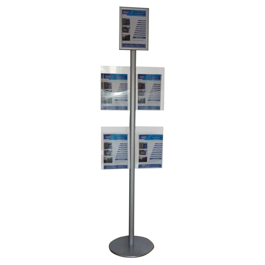Stojak reklamowy zbudowany z aluminiowego słupka o przekroju okrągłym fi 50 mm wysokości 200 cm na stalowej podstawie fi 40 cm, do którego można dokręcać z jednej lub dwóch stron aluminiowe ramki zatrzaskowe ( OWZ ) różnych wielkości. Stojak można dodatkowo wyposażyć w przezroczyste plastikowe kieszenie na ulotki A4. Cena netto z jedną tablicą A1 ( 60*85 cm, jak na zdjęciu ) – 379,00 zł netto.