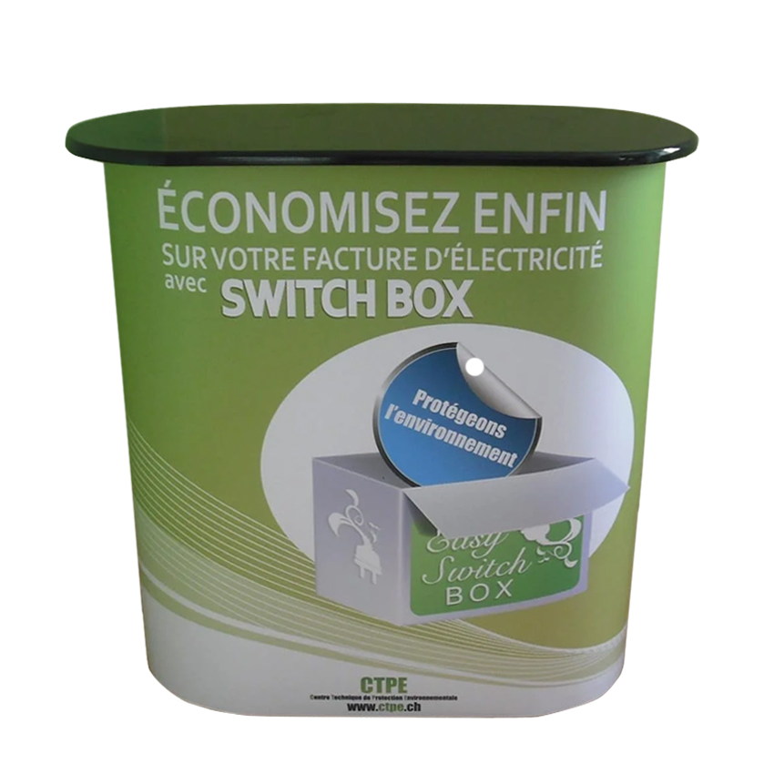Konstrukcja aluminiowa 1 x 2 moduły jak w ściankach Pop Up, owijana mocowanym magnetycznie panelem na grafikę o wysokości 86 cm i długości 169 cm (widoczne 90 cm).