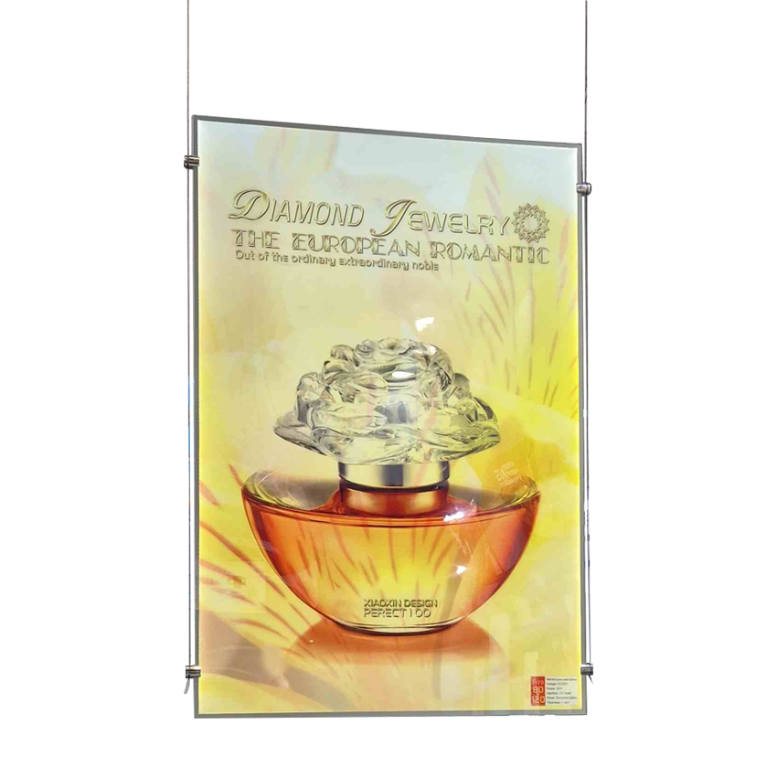 Rewelacyjne cenowo ramki grubości jedynie 10 mm o korpusie wykonanym z aluminium, z płytą czołową z hartowanego szkła i bokami z plastiku. Grafika, najlepiej wydrukowana na folii do podświetleń, jest wsuwana od góry w szczelinę w ramce, jest jasno ( 6500 lux) i równomiernie podświetlana światłem o neutralnej barwie ( 6000K ). Zasilacz 12 V lub 24 V z kabelkiem długości 1,5 m i wtyczką jest dołączony do zestawu.