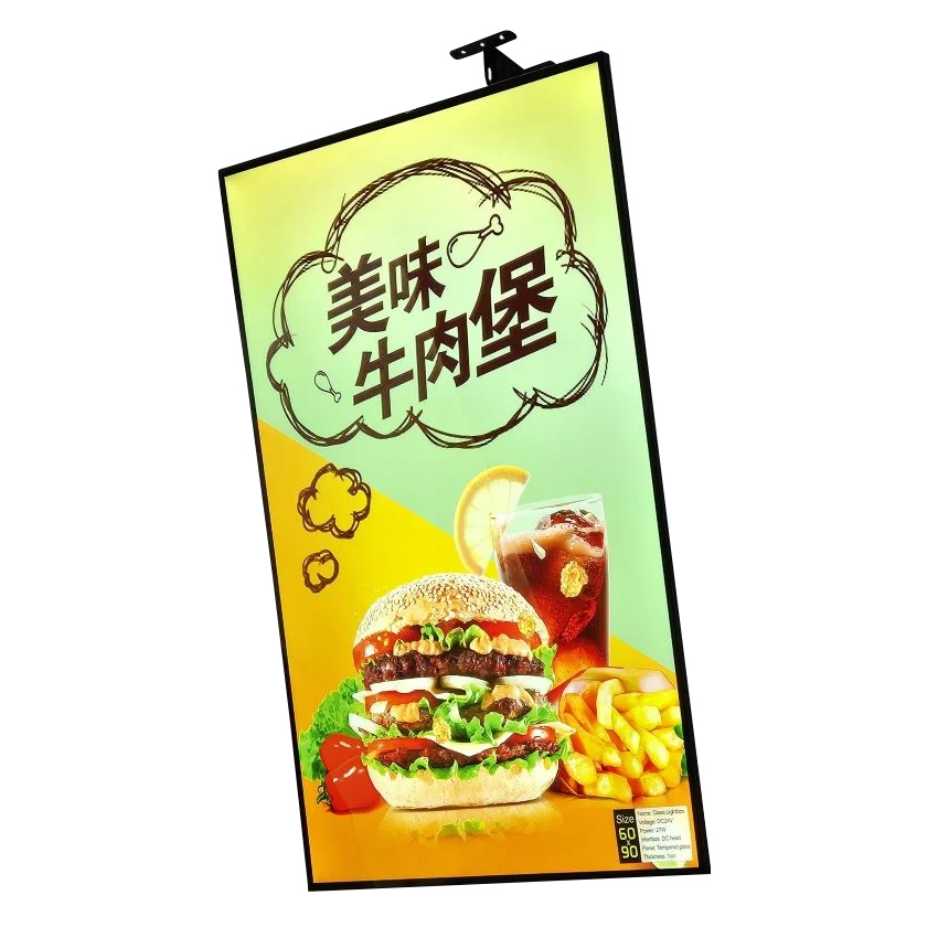 – ramki podwieszane do zainstalowania w punktach gastronomicznych, nad barem, kasą itp. Specjalny teleskopowy wysięgnik długości 0,6 – 1,0 m umożliwia przymocowanie ich do sufitu lub ściany, w pozycji pionowej lub poziomej.